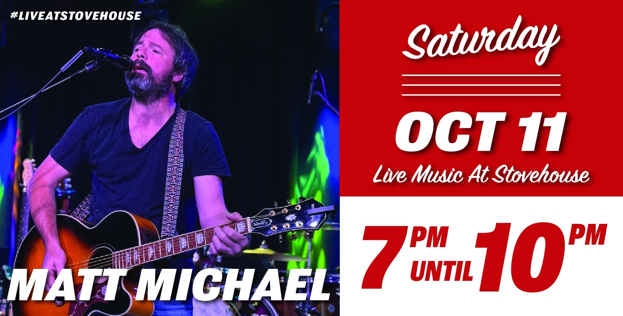 Matt Michael LIVE at Stovehouse 📍Stovehouse Food Garden Leisure Lawn Stage 📅October 11, 2025 ⏰ 7:00pm to 10:00pm 🎟️ FREE + all ages welcome