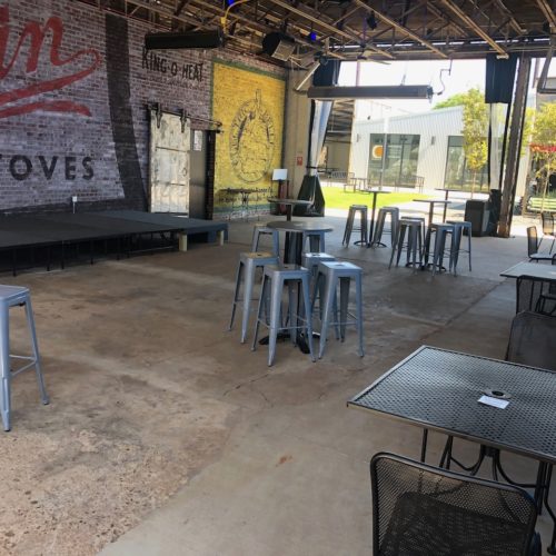 This industrial, covered open-air space features a Martin Stove mural wall, stage lighting, and a full sound system. Outdoor heaters and fans (along with clear vinyl curtains) help temper the weather to make this outdoor space more comfortable.